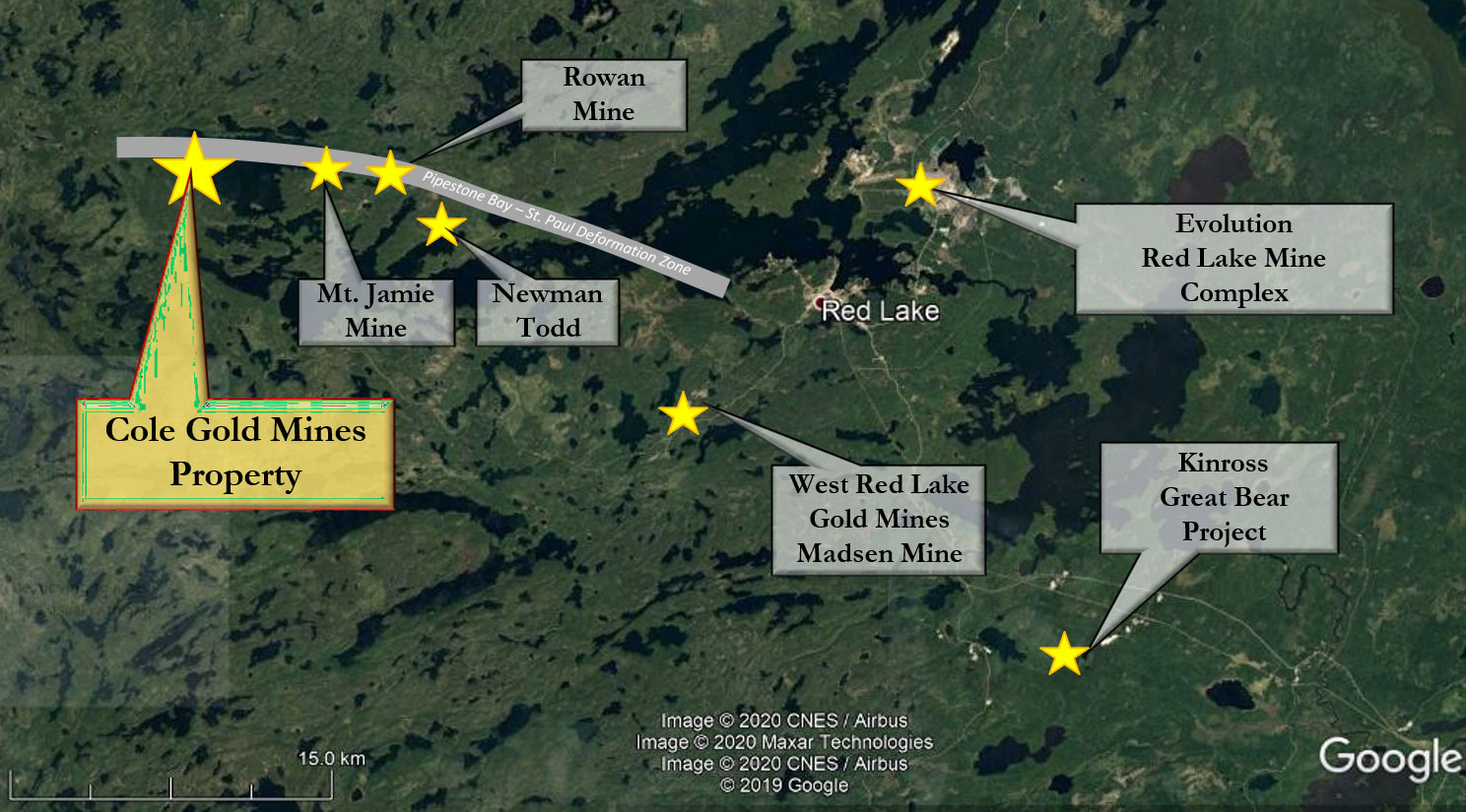 The Red Lake mining camp is one of the most prolific gold districts in Canada, having produced more than 30 million ounces of gold from 28 mines. The Cole Gold Mines Property sits within the Pipestone Bay Deformation Zone, approximately 30 kilometres west of the Cochenour, Campbell, and Red Lake Mine Complex. Its position places it among some of the district’s most significant operations and discoveries, including Evolution Mining’s Red Lake Mine Complex, Kinross’s Great Bear Project, and West Red Lake Gold Mines' Madsen Mine.