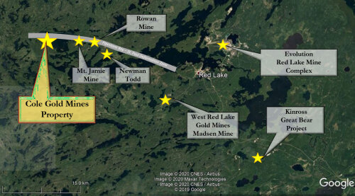 The Cole Gold Mines project totals approx. 1,438 ha located in the prolific Red Lake Mining District adjoining West Red Lake Gold Mines Ltd. The Red Lake district is renowned for high-grade gold in structures with significant depth extent and has produced over 30 million ounces of gold.